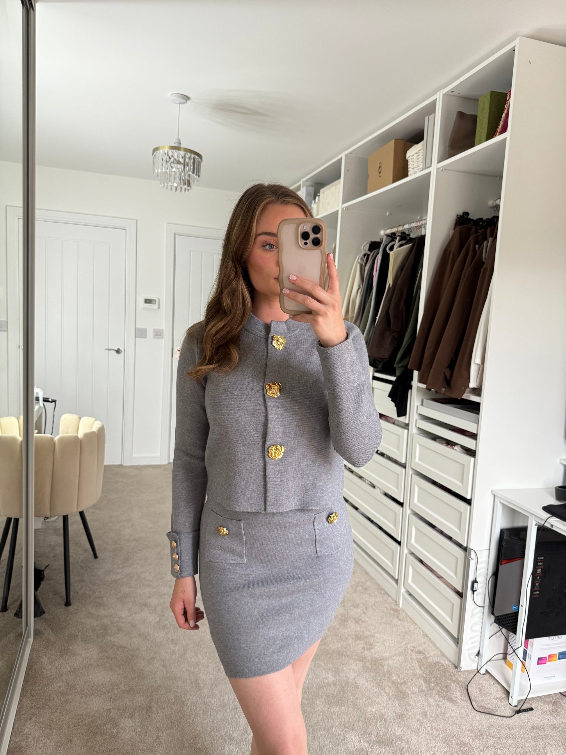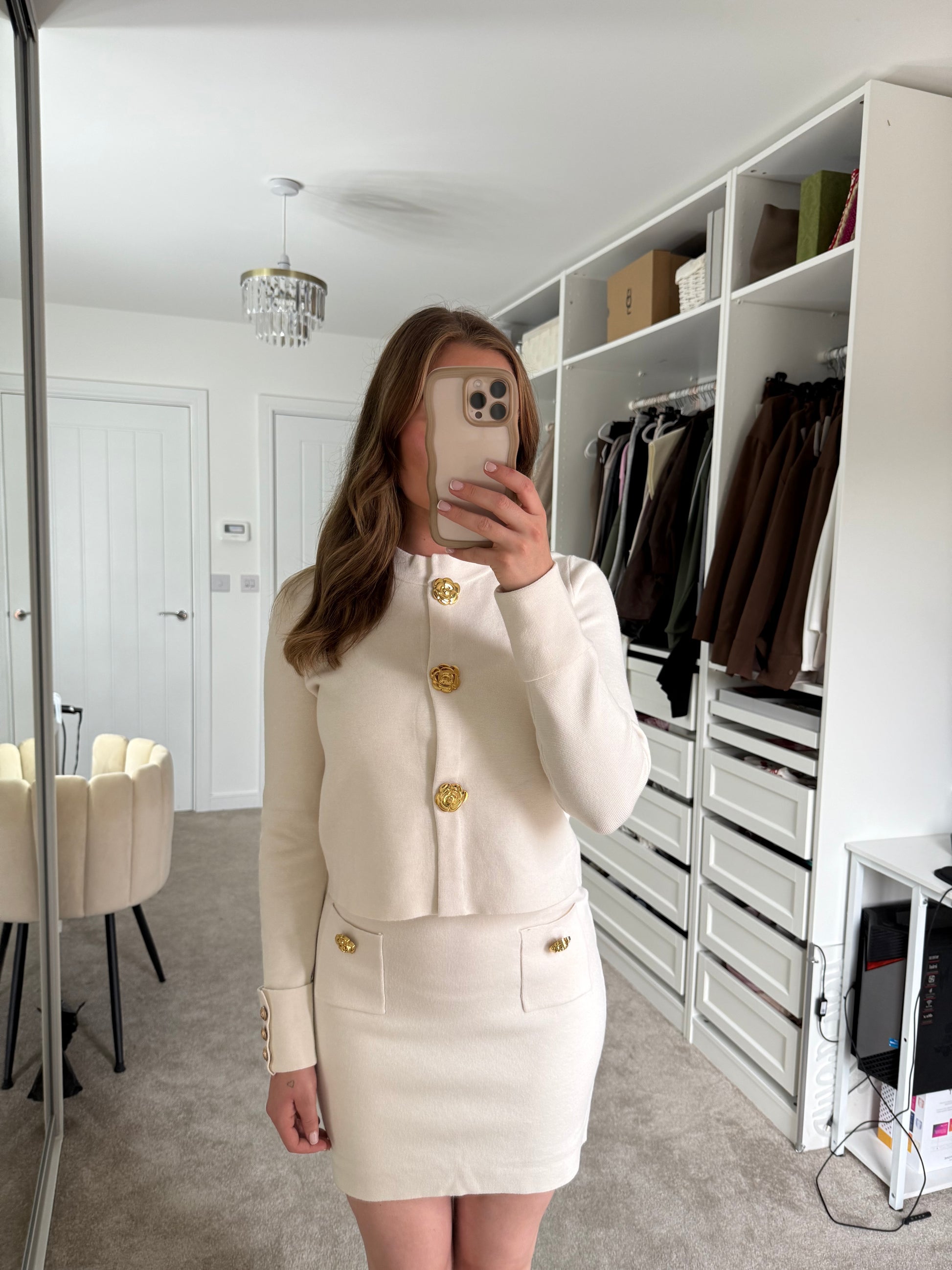 Soft knit skirt and cardigan set - gold button details